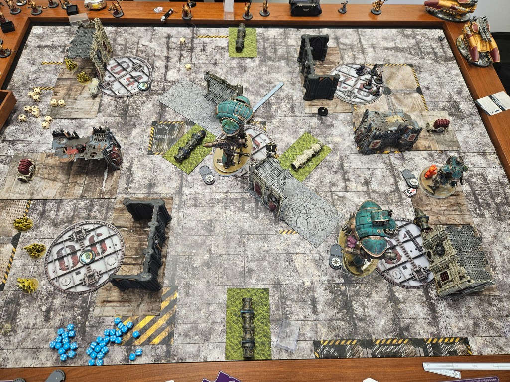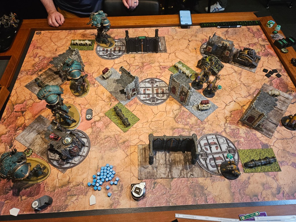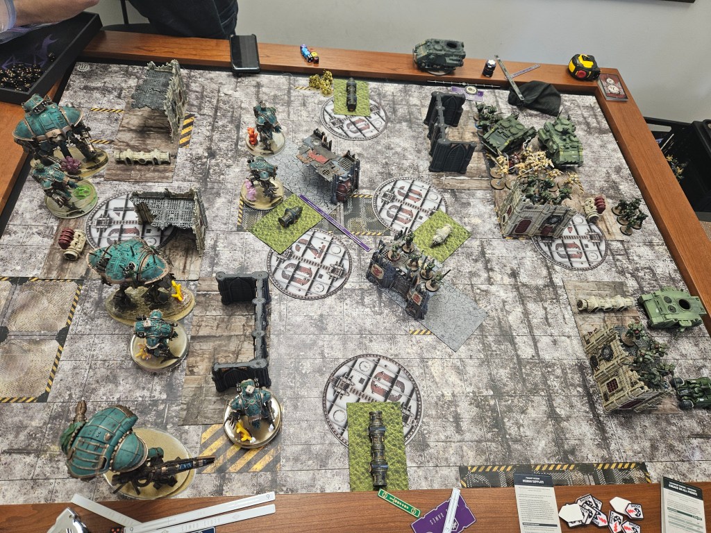 He draws Bring it Down and Recover Assets. I am thrilled because the only way he can’t get a bead on any of my knights with multiple models, and his Lord of Virulence is tucked inside his home ruin so he can’t give full rerolls to stuff. I am totally safe and he just positions some stuff closer to the center for next turn and blasts the nurglings off the board with PBCs.