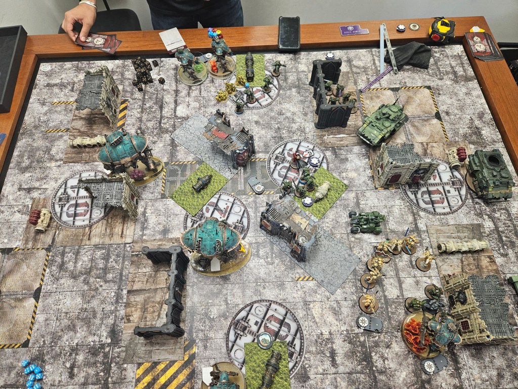 He manages to pass all of his battleshocks (boo) and draws Engage on All Fronts and Secure No Man’s Land. At this point it’s still touch and go but I feel pretty firmly in the driver’s seat. He needs basically every activation to go right to be in the game on round 5.