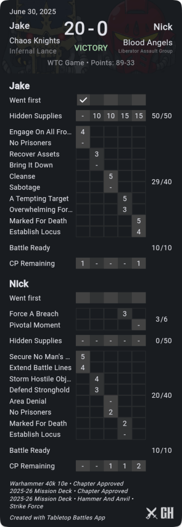 This is a reminder to think out your whole movement phase before just moving shit, and just because you can advance, doesn’t mean you have to. That was 3 points I gave up by just being overly hasty.